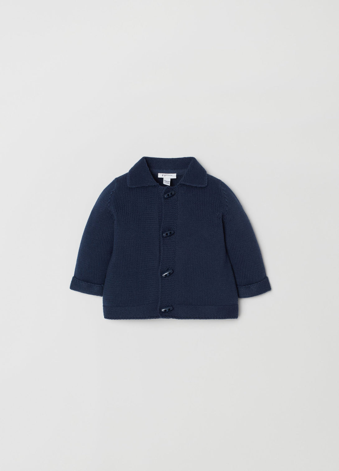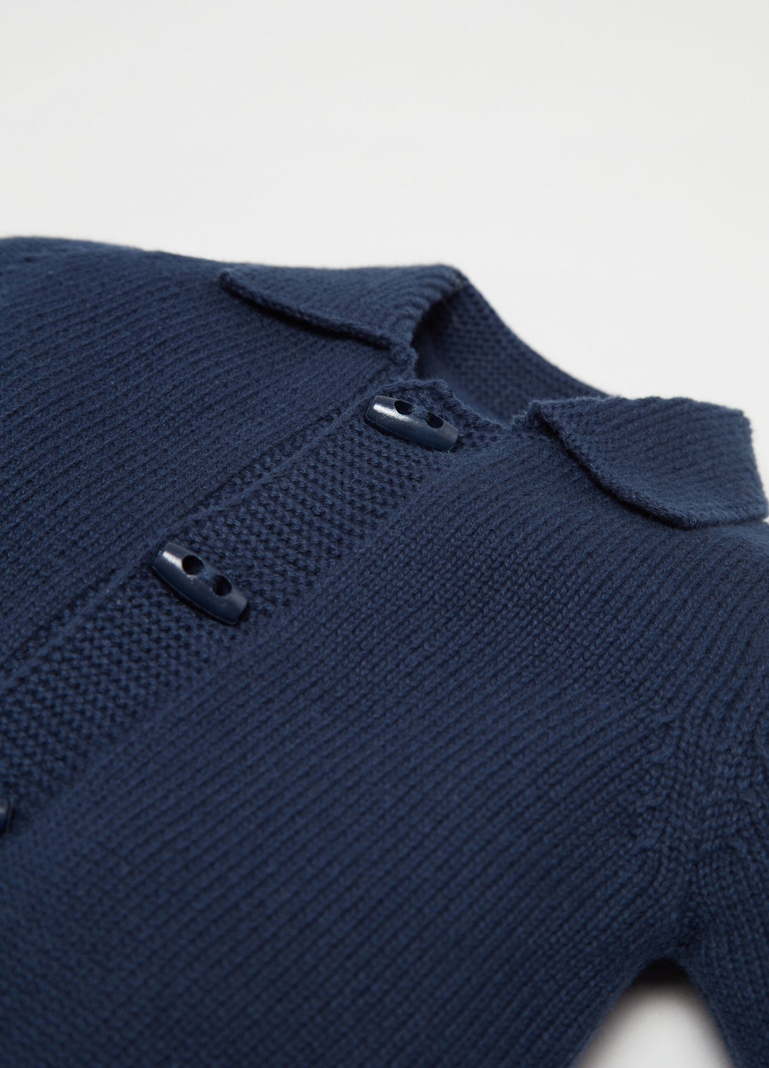 Knitted cardigan in 100% cotton. Bluff collar. Toggle fastening.