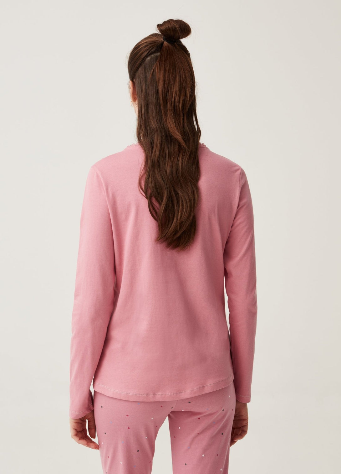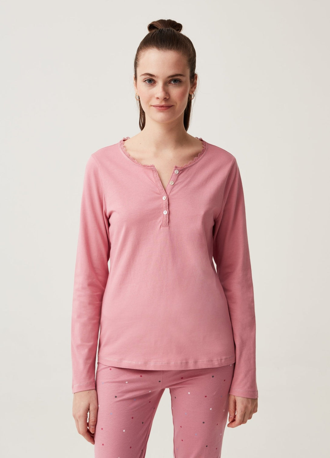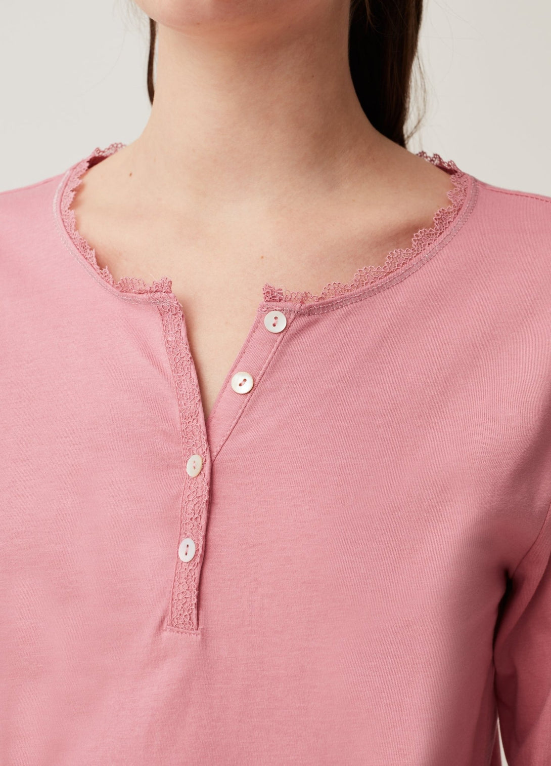 Solid colour pyjama top in 100% cotton. Granddad neckline and lace trim. Long sleeves.