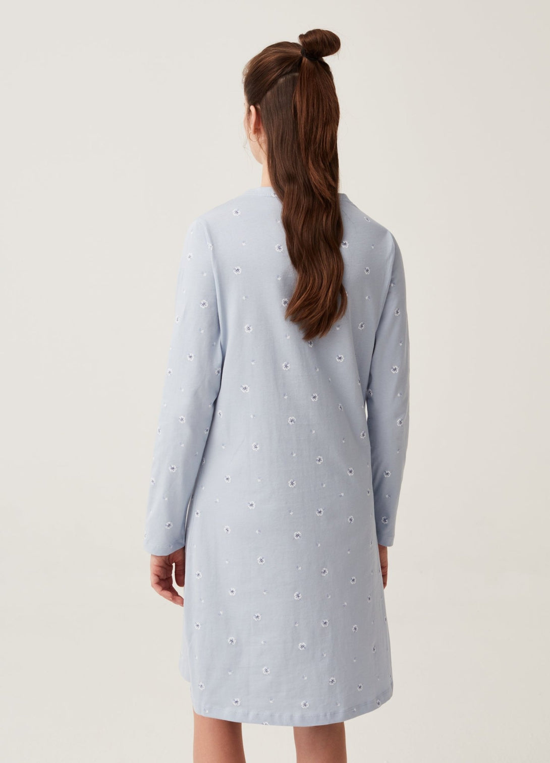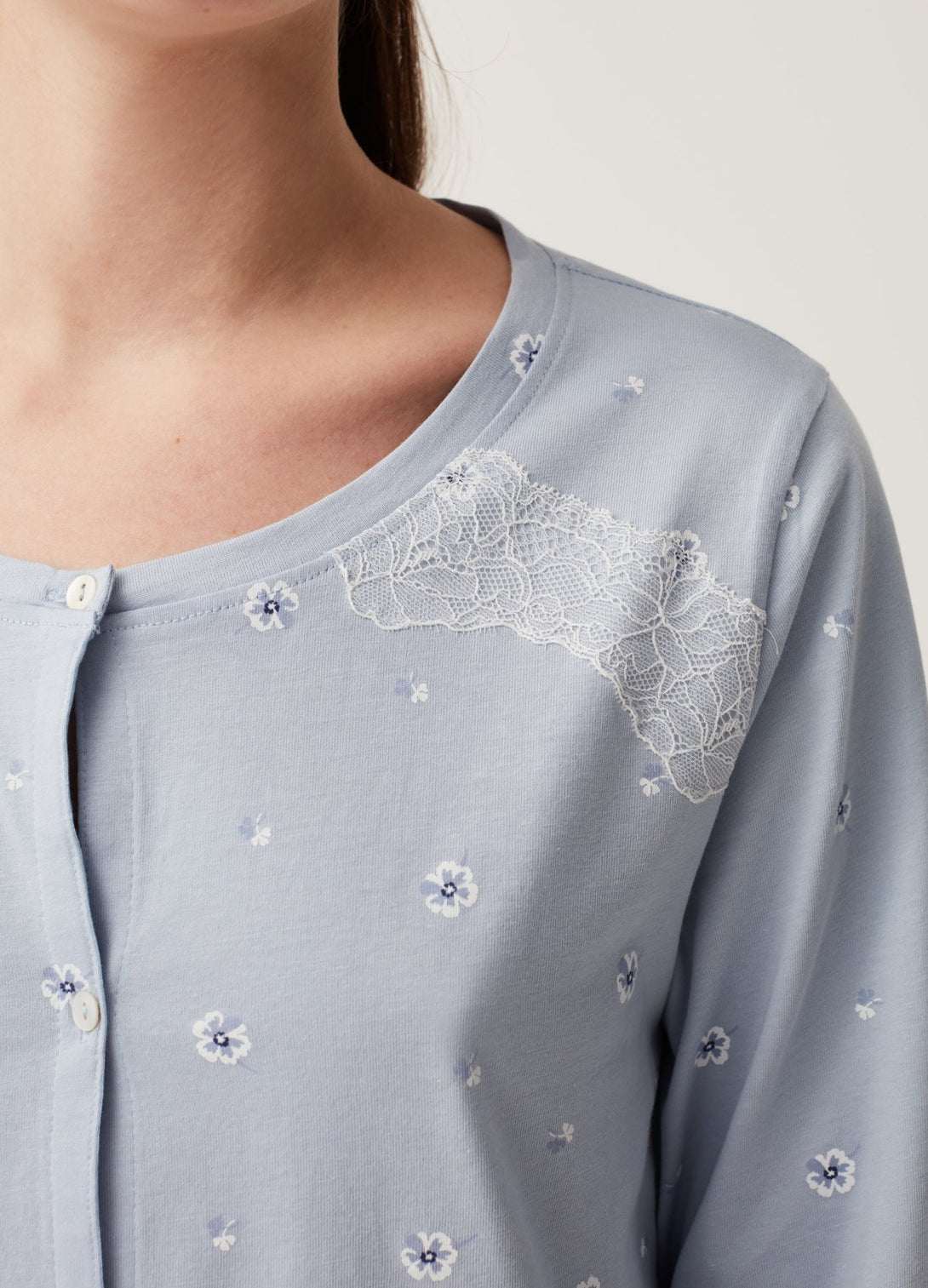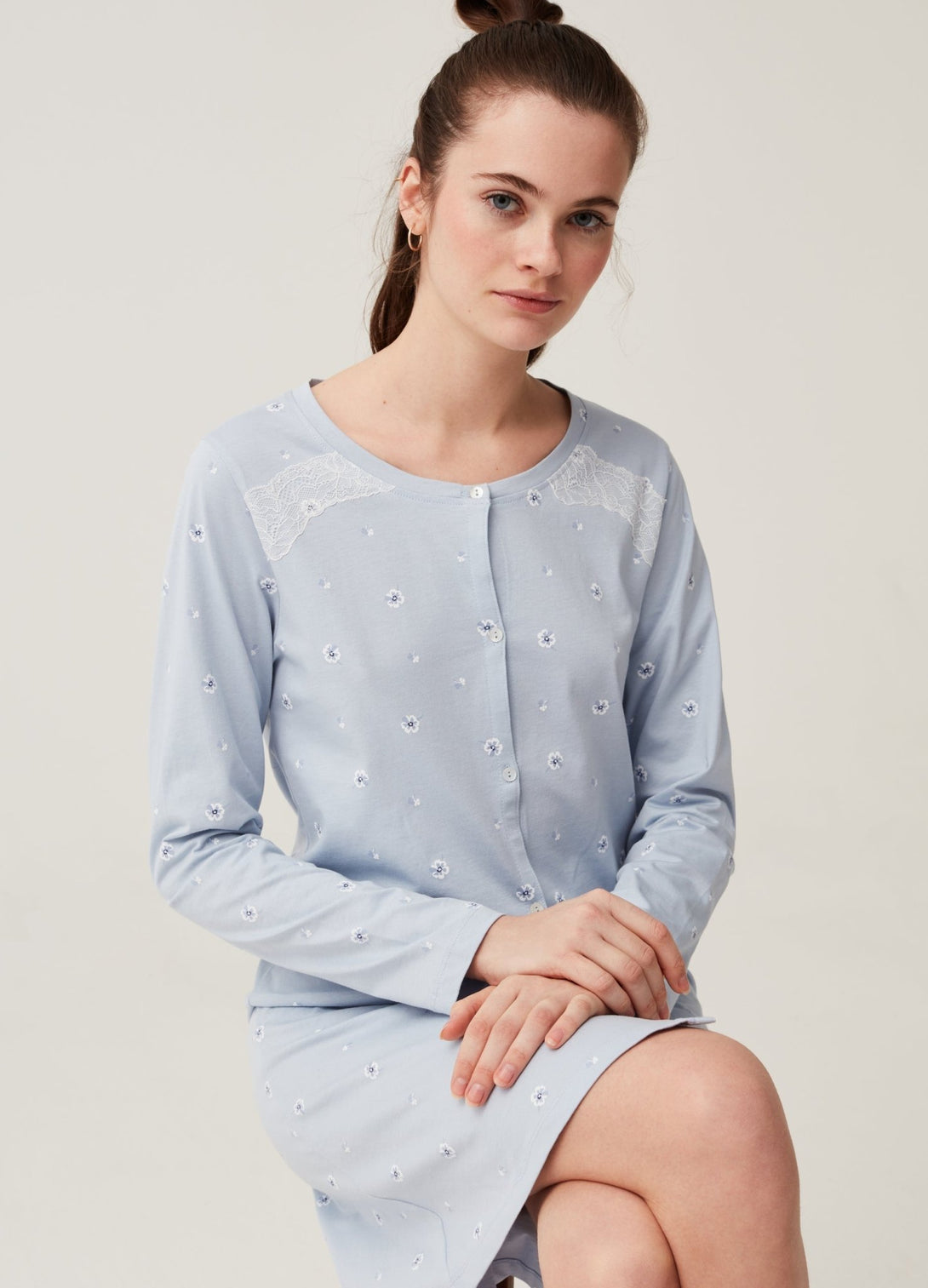 100% cotton nightdress with floral print. Round neck. Lace inserts on shoulders. Long sleeves. Button fastening.