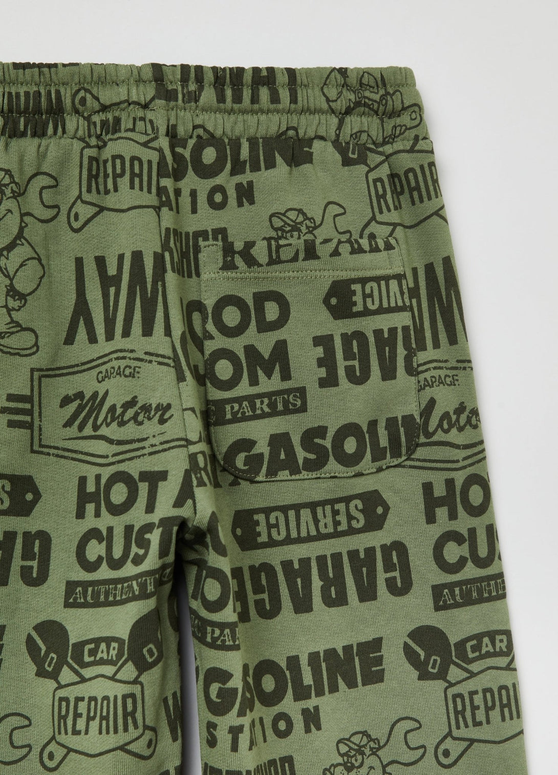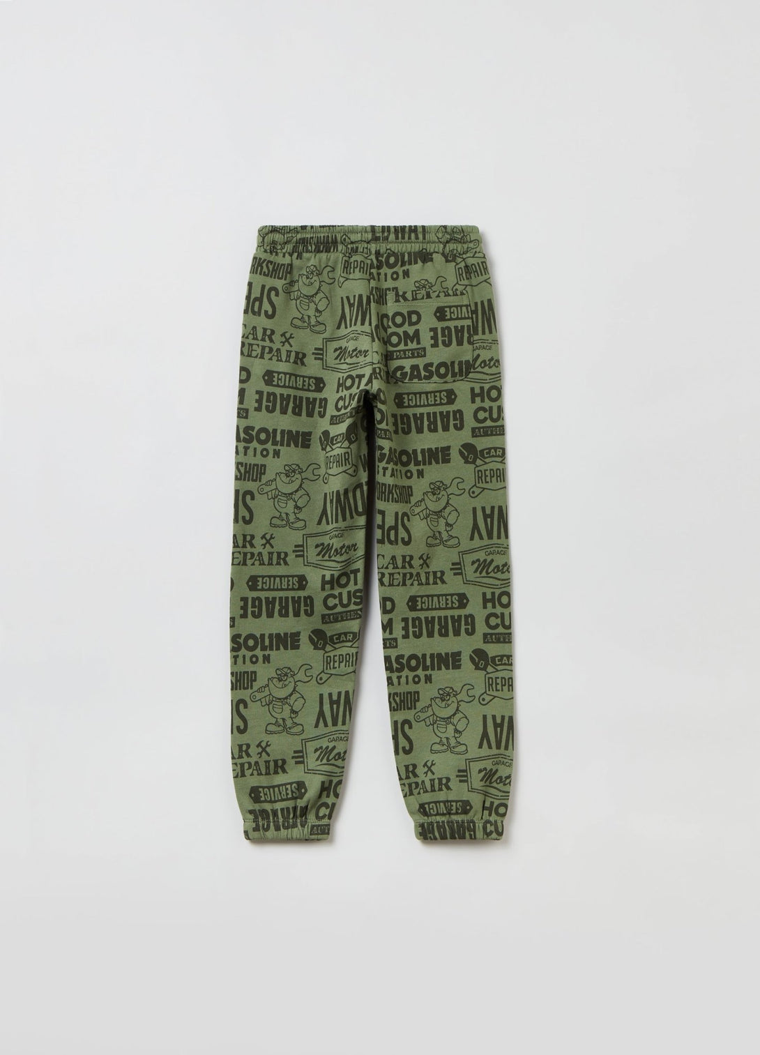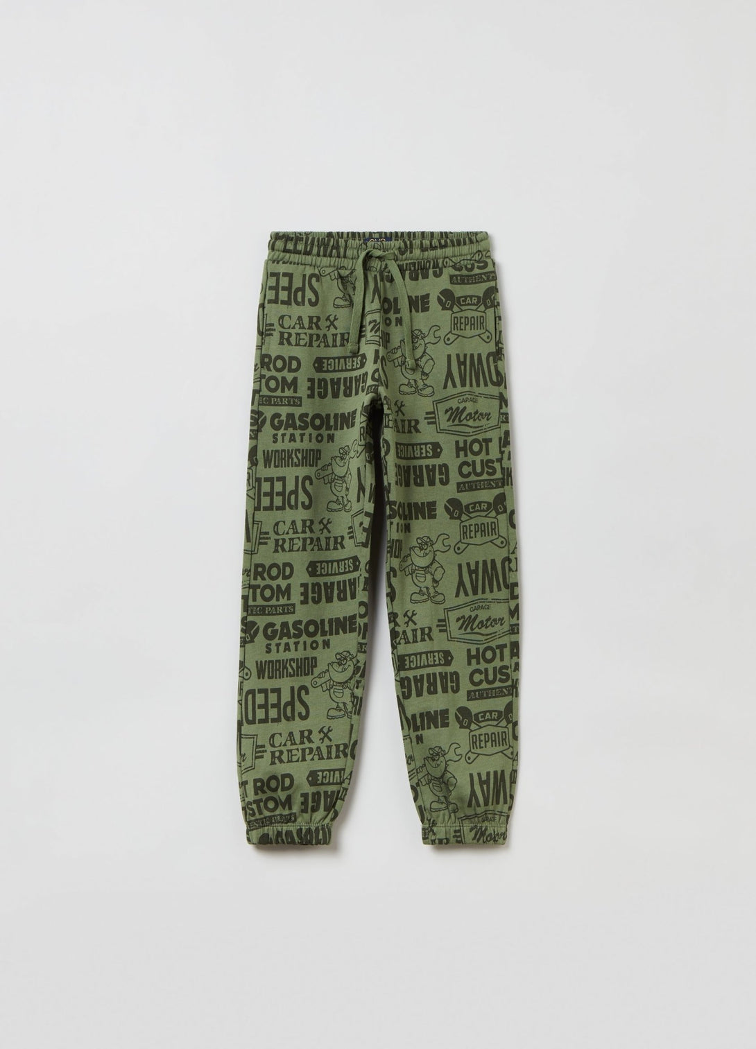100% cotton plush joggers with drawstring. Two vertical pockets and one patch pocket on the back. Lettering and racing car motif and dog mechanic all-over print Elasticated waistband and ankles.