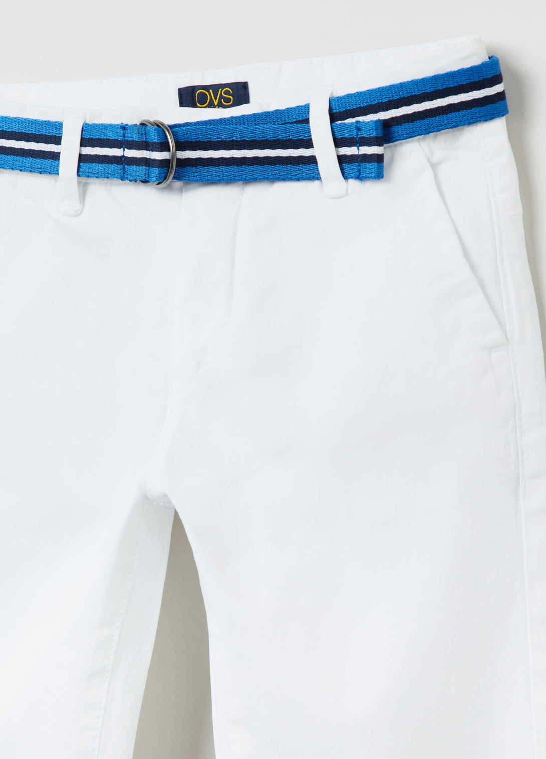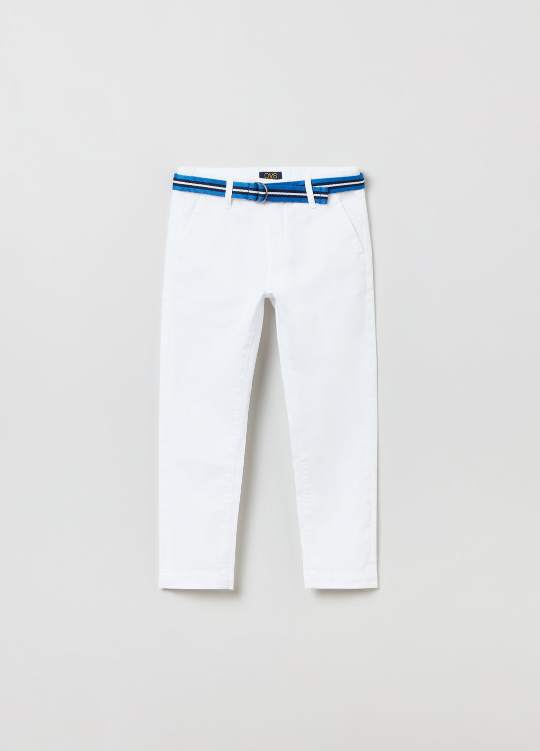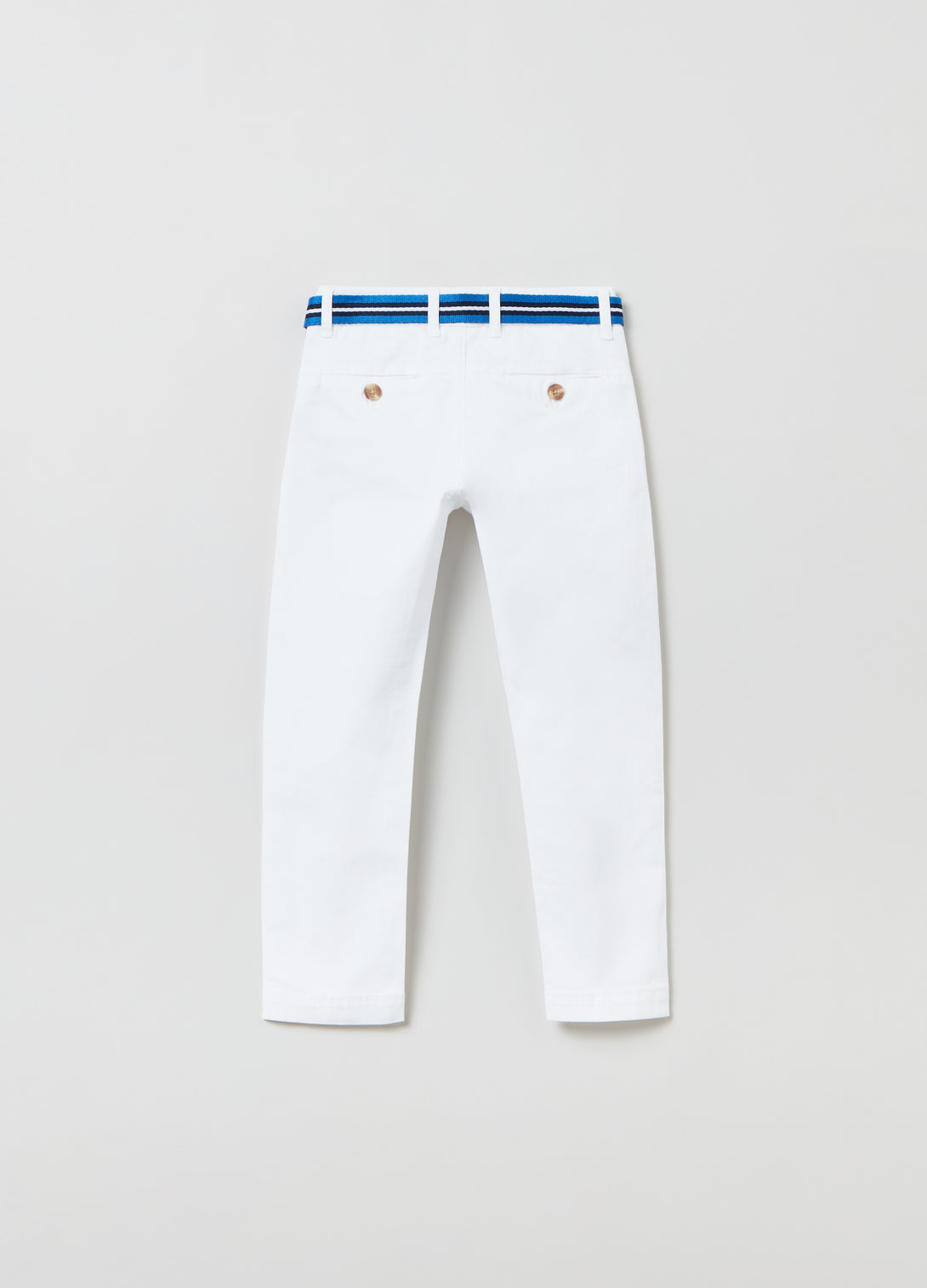 Chino trousers in stretch cotton with striped belt with ring buckle. Two slant pockets and two welt pockets with button on the back. Zip and button fastening.
