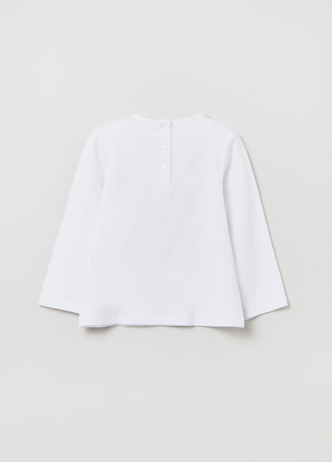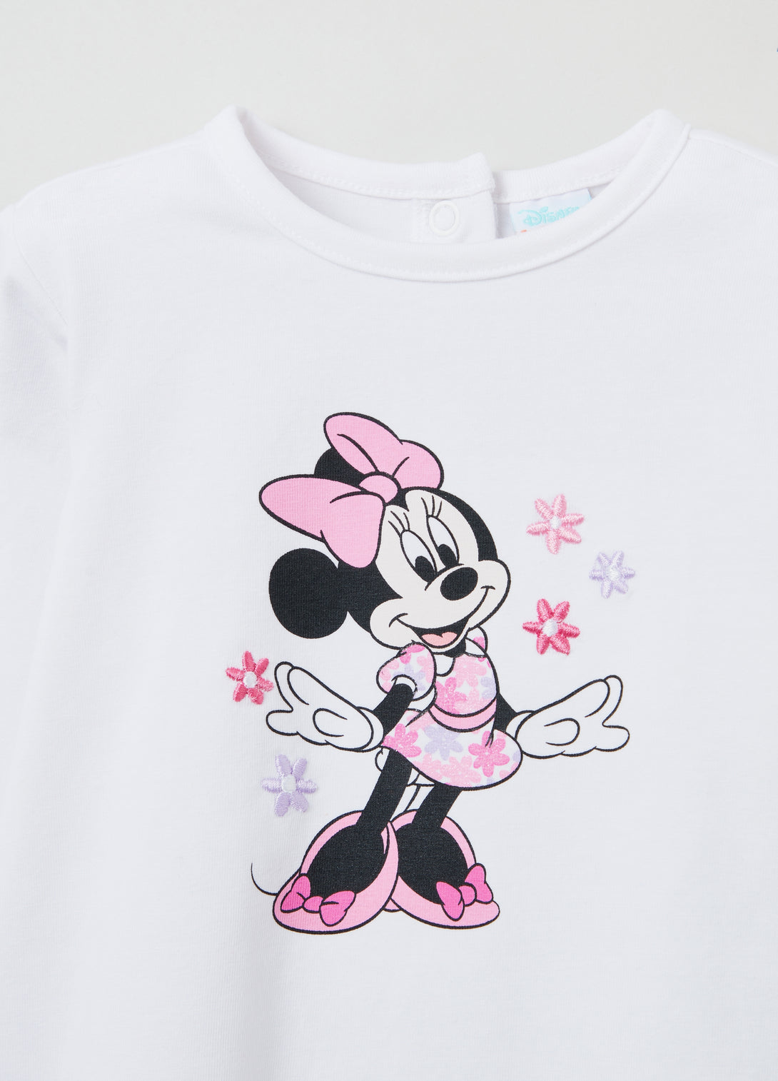 Long-sleeved T-shirt in stretch cotton. Round neck. Disney Baby Minnie Mouse print with glitter detailing and embroidered flowers. Snap-button fastening on the back.