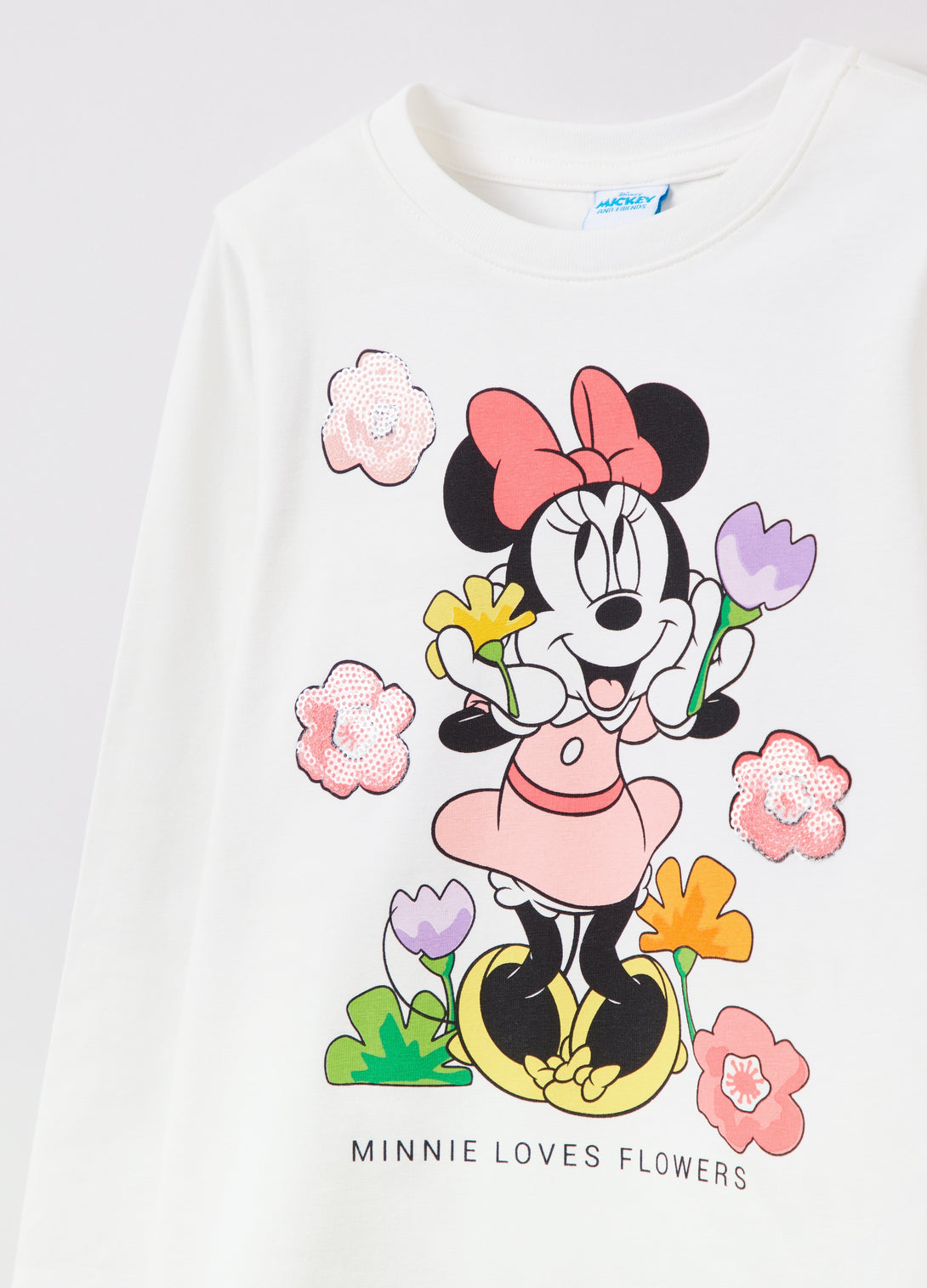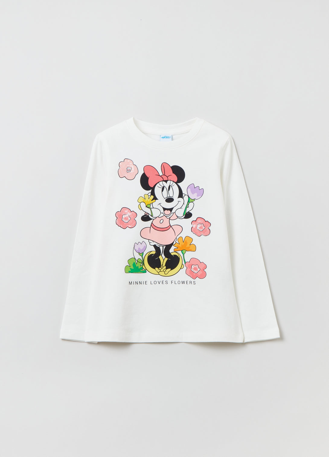 Long-sleeved T-shirt in stretch cotton. Round ribbed neck. Disney Minnie Mouse print with flowers and sequins on the front.