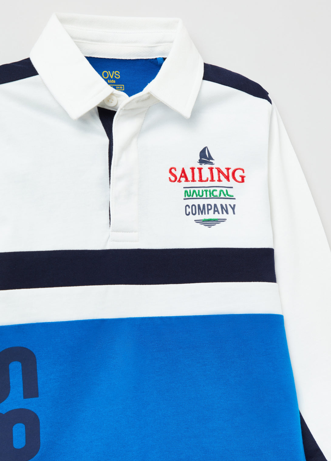 Colour block polo shirt in 100% cotton. Twill collar and concealed buttons. Nautical motif embroidery and print on chest and side.
