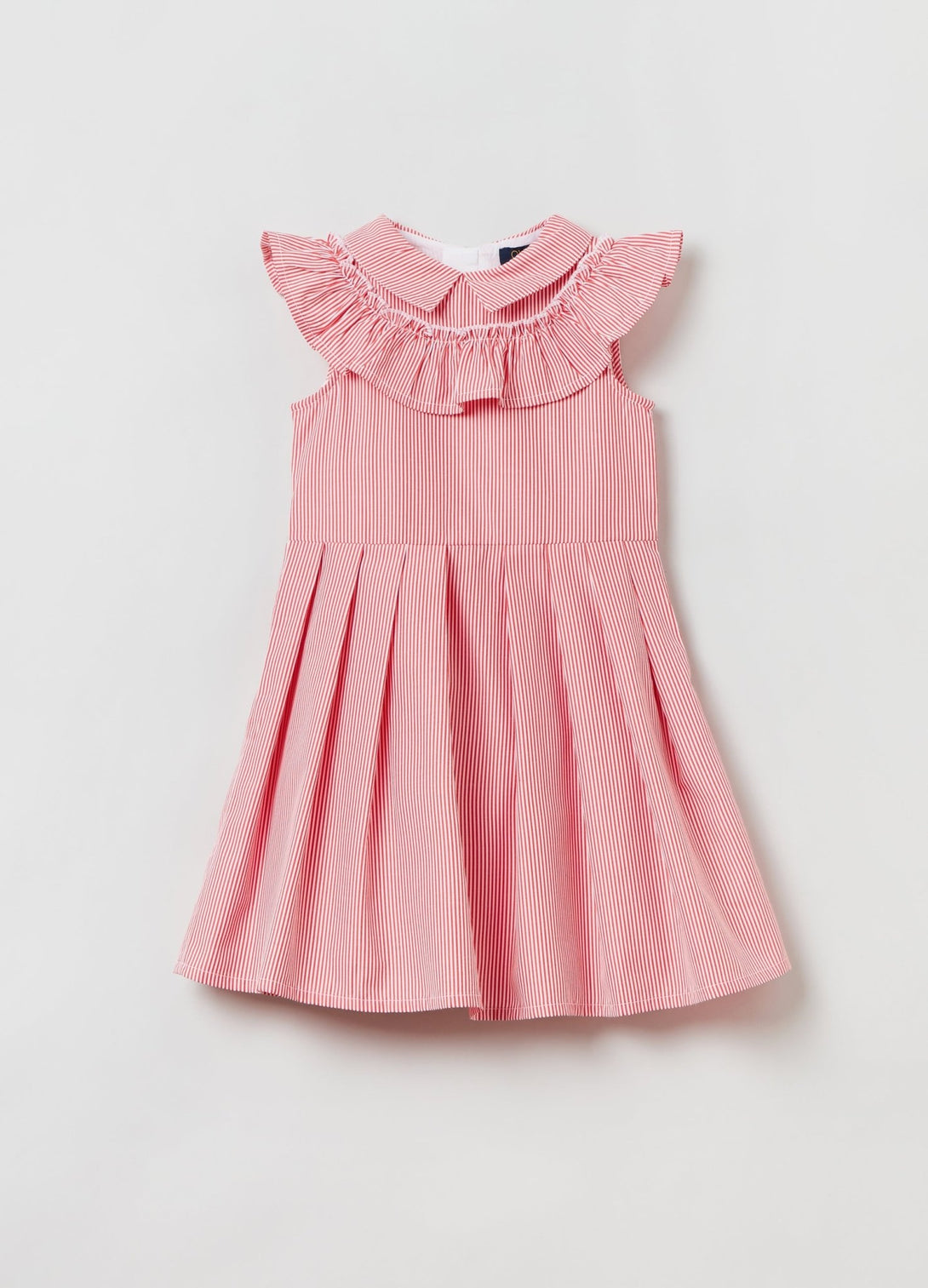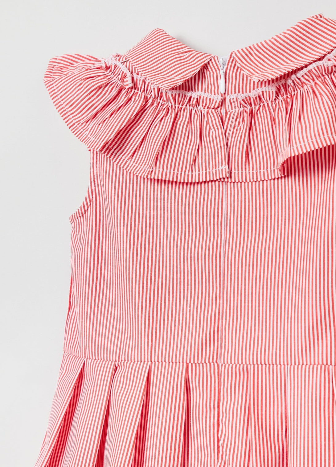 Sleeveless dress in cotton blend with pleated skirt. 100% cotton lining. Striped pattern. Bluff collar with flounce appliqué. Zip fastening on the back.