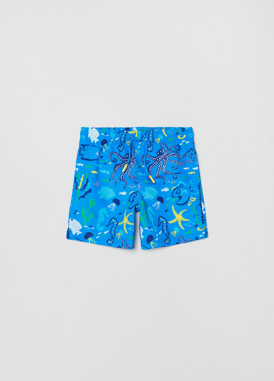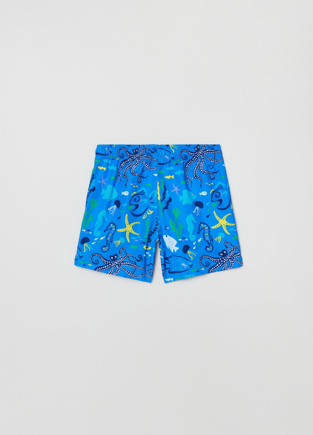 Swimming trunks with drawstring. All-over marine animals print. Two vertical pockets.