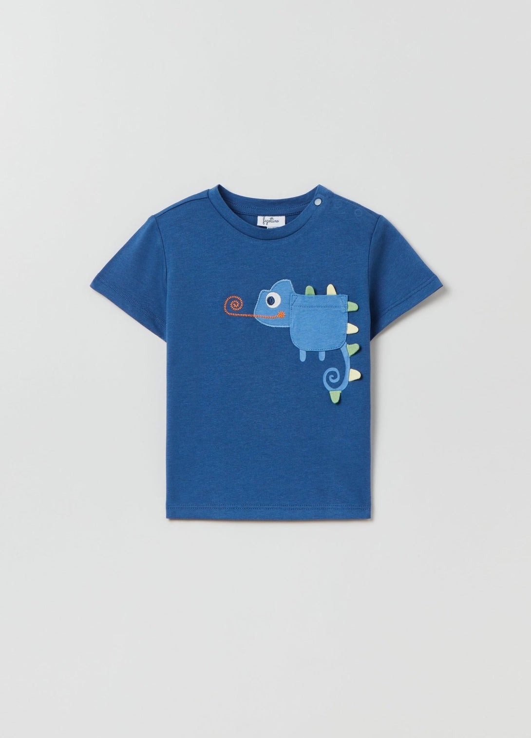 100% cotton T-shirt. Round neck with snap buttons on the shoulder. Patch pocket on the chest. Embroidered chameleon with appliqué crest.