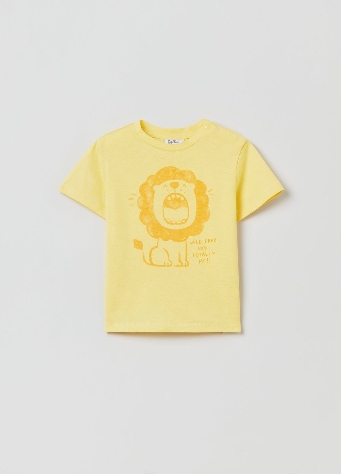 100% cotton T-shirt. Round neck with snap buttons on the shoulder. Lion and lettering print on the front.