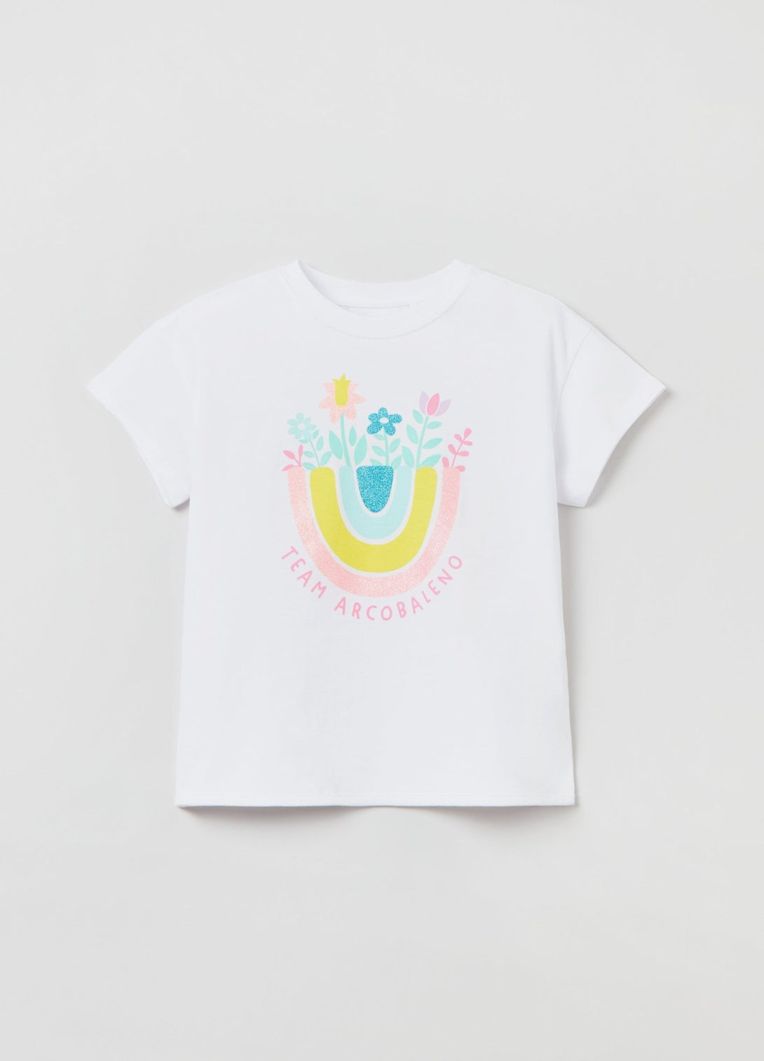 100% cotton T-shirt. Round neckline. Flower and lettering print with glitter details.