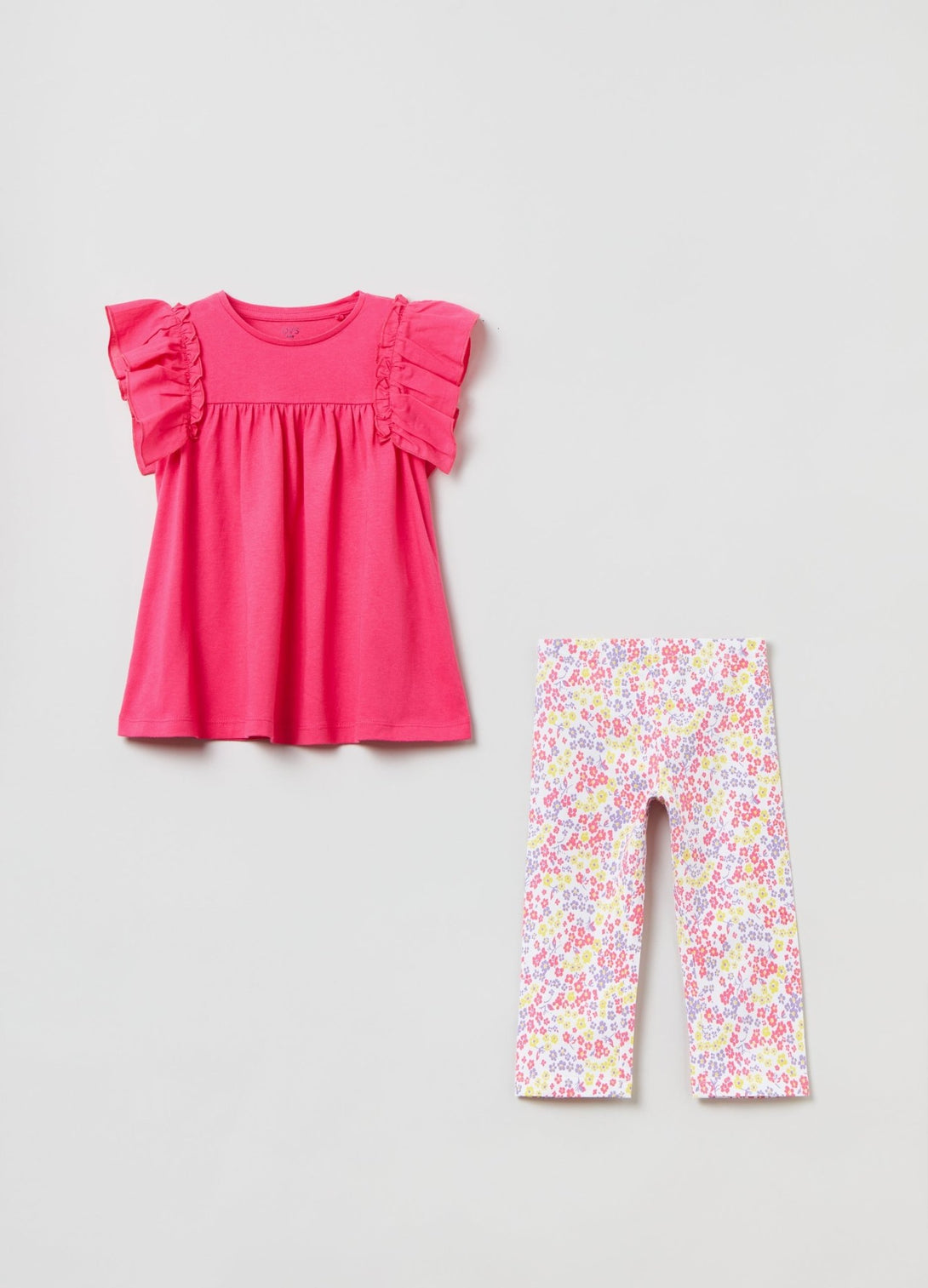 Jogging set with 100% cotton T-shirt and stretch cotton leggings. Sleeveless T-shirt with round neck. Appliqué frill on arms. Leggings with elasticated waist band and all-over flower print.